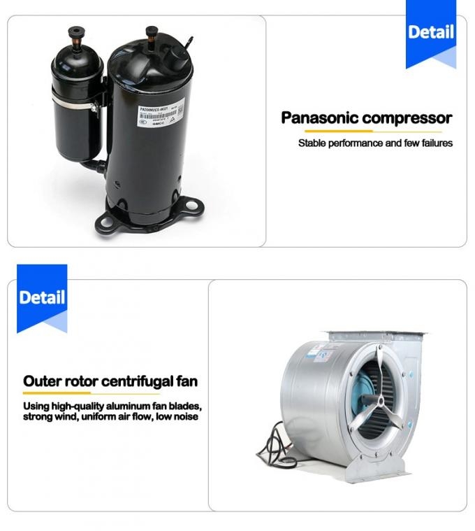 * The core components of the WX-180 integrated air conditioner are selected from famous domestic and foreign brands,It is professionally improved, upgraded, designed and manufactured by our company.The main part is equipped with Panasonic scroll compressor,Emerson thermal expansion valve,Danfoss molecular sieve filter drier, etc.Realize the effective cooling of cold air,Make the refrigeration capacity stronger.The machine is simple and safe to operate,Low noise,High energy efficiency,The American Emerson thermal expansion valve used has a wide range of variable working conditions,The machine runs stably in different high and low temperature environments.The unit's energy increases freely, the assembly is reasonable, and the installation is simple and convenient.