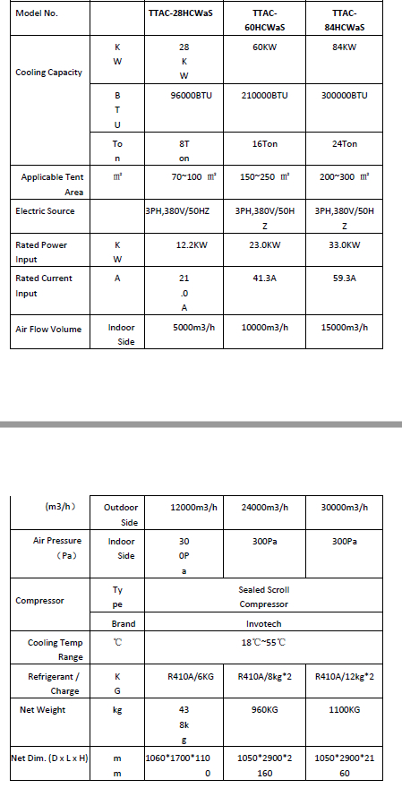 The tent air conditioner contains the evaporator and a centrifugal fan, which draws warm internal air of the tent through the cold evaporator and blows out the cooled air through the side or the top of the unit. The condenser section contains two condenser coils and a large axial fan, returning the heat taken from the internal air to the outside atmosphere.The Tent air conditioner also have heat pump,can supply warm air into the tent in winter. use the Panasonic scroll compressor, our Tent air conditioner can supply hot air at -10℃ to 20℃.